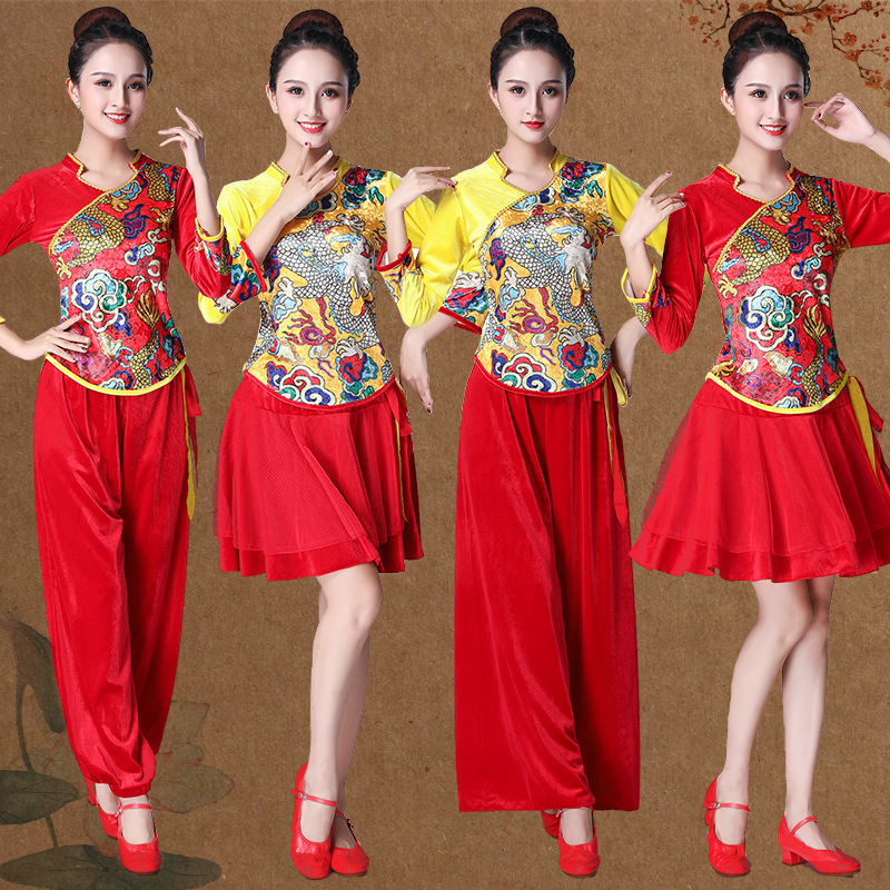 Pakaian dansa persegi musim gugur dan musim dingin sulaman beludru emas gaya etnik Tiongkok jam tangan setengah baya dan grup wanita pakaian kinerja setelan