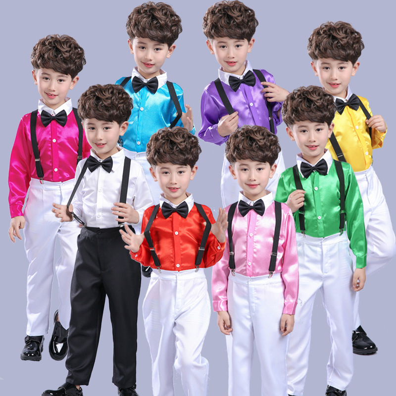 Celana suspender anak pria dan wanita, pakaian pertunjukan host kinerja paduan suara celana panjang suspender musim gugur dan musim dingin