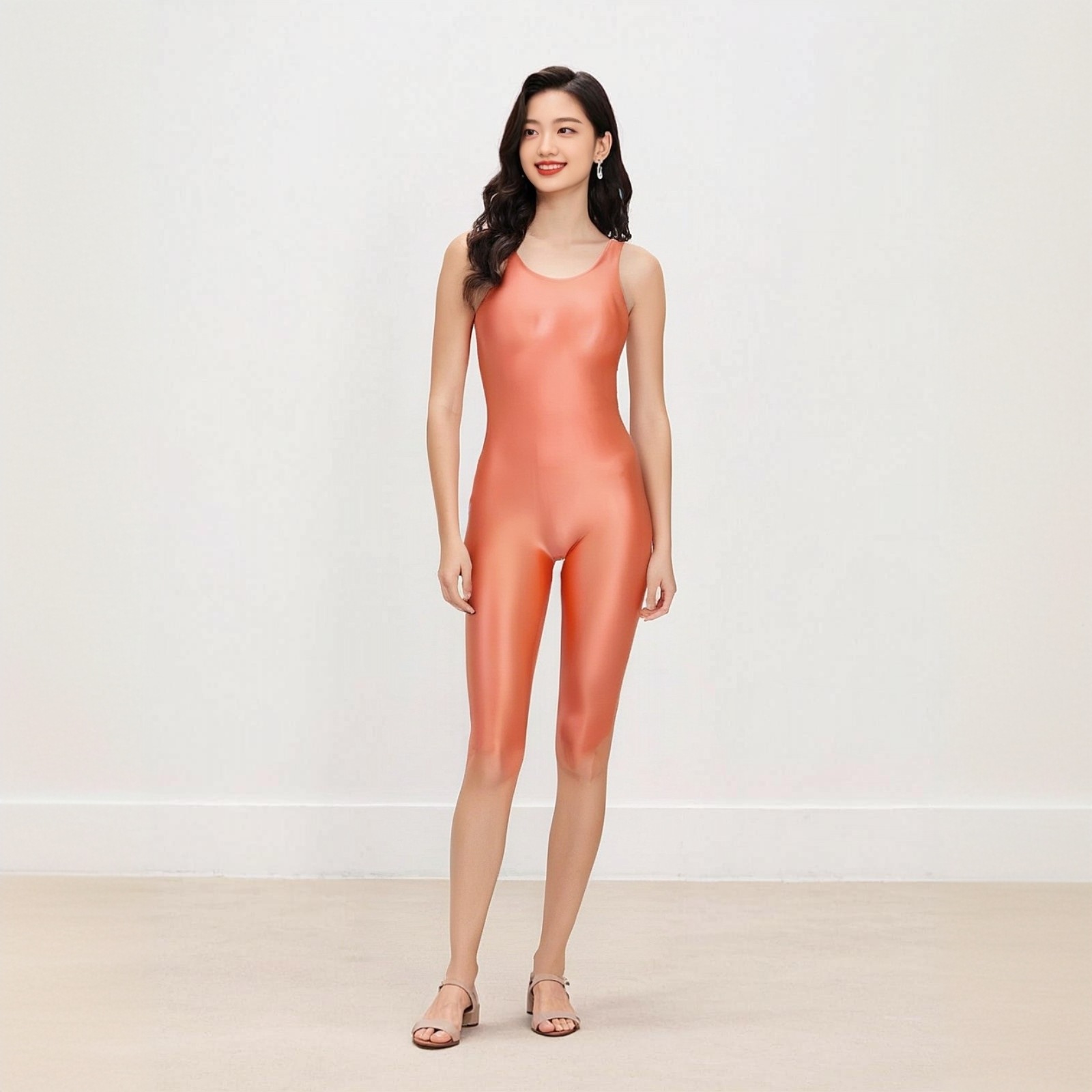 Jumpsuit olahraga binaraga rompi wanita dengan celana selutut ketat mengkilap melar pakaian senam pakaian yoga