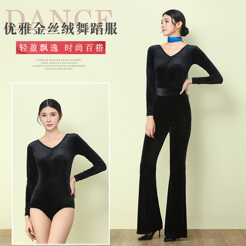 Pakaian latihan injeksi tubuh elegan, pakaian tari persegi elegan, pakaian latihan dansa dewasa, beludru emas