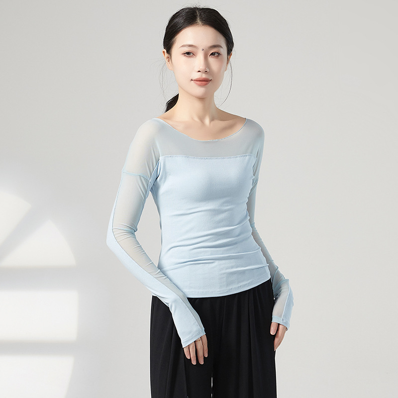 Pakaian dansa klasik elegan, baju atasan lengan panjang tari modern ramping jahitan jala