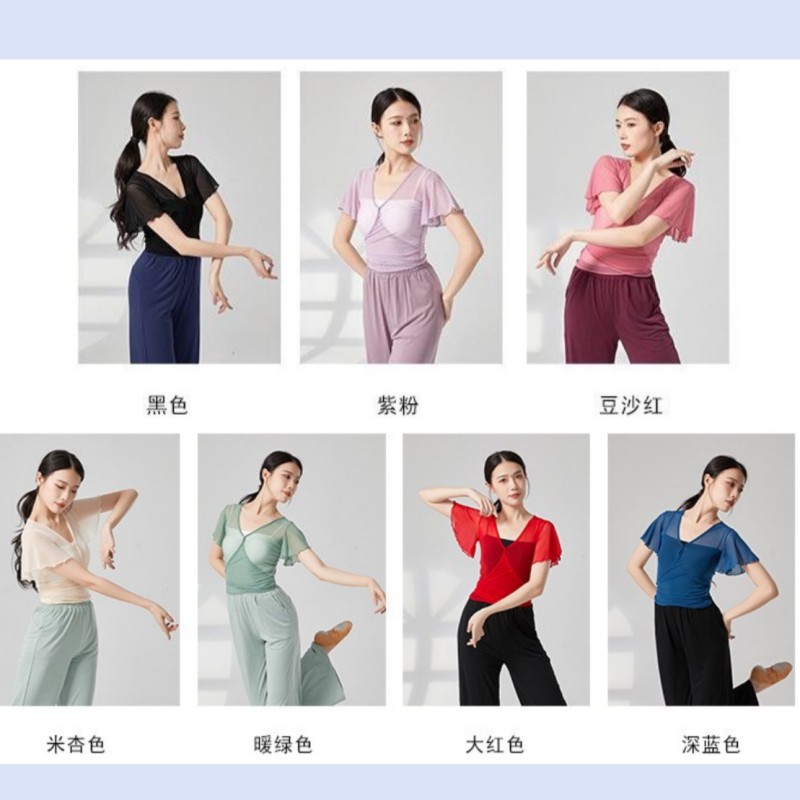 Pakaian tari klasik dasar latihan tubuh Rima pakaian latihan tari jaring pendek atasan kasa wanita elegan lengan terbang kecil