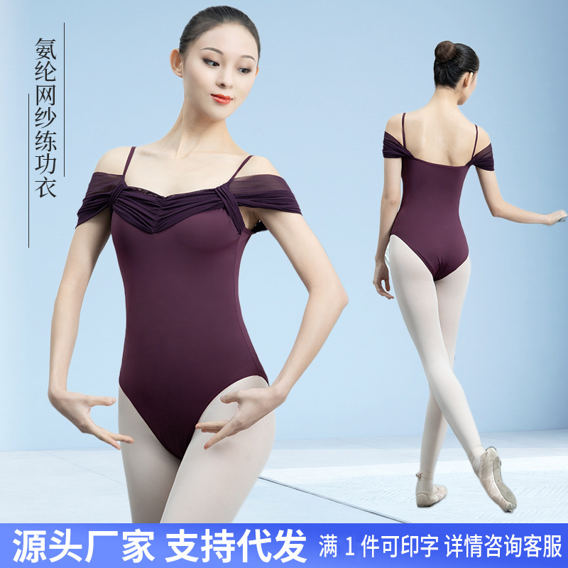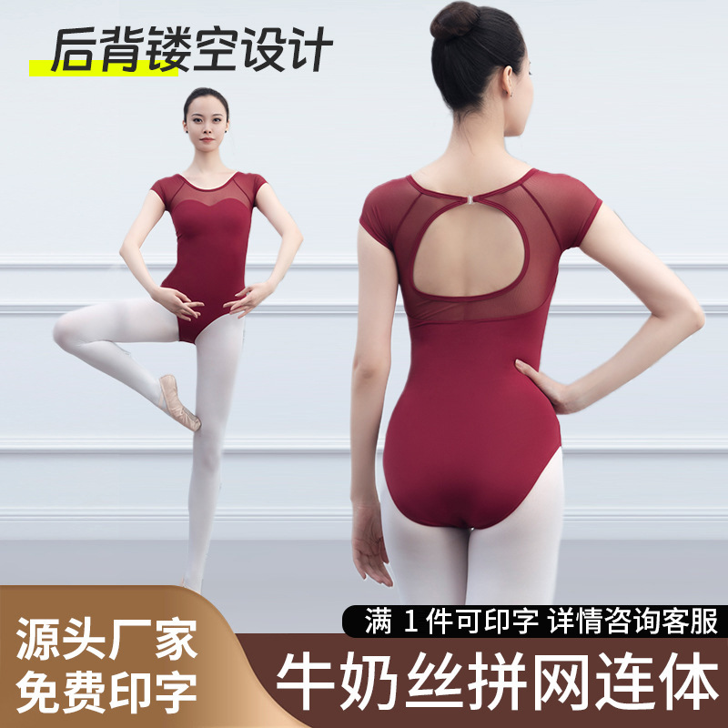 Kostum tari balet dewasa dengan punggung berlubang, lengan pendek, patchwork jala, leotard satu potong, pakaian tari untuk ujian, desain berlubang.