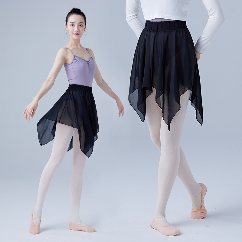 Rok dansa dewasa, bawahan sifon balet, rok panjang setengah, kinerja, rok hitam klasik tidak rata