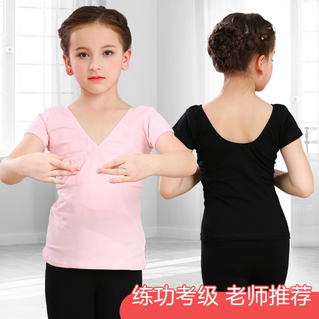 Pakaian dansa anak-anak pakaian latihan musim panas wanita baju dansa lengan pendek leher-v silang pakaian pentas baju kinerja