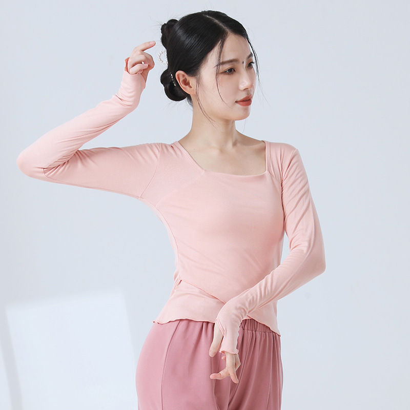 Baju dansa wanita, desain dasar tari Modern, lengan panjang ramping warna polos Klasik jazz kerah persegi
