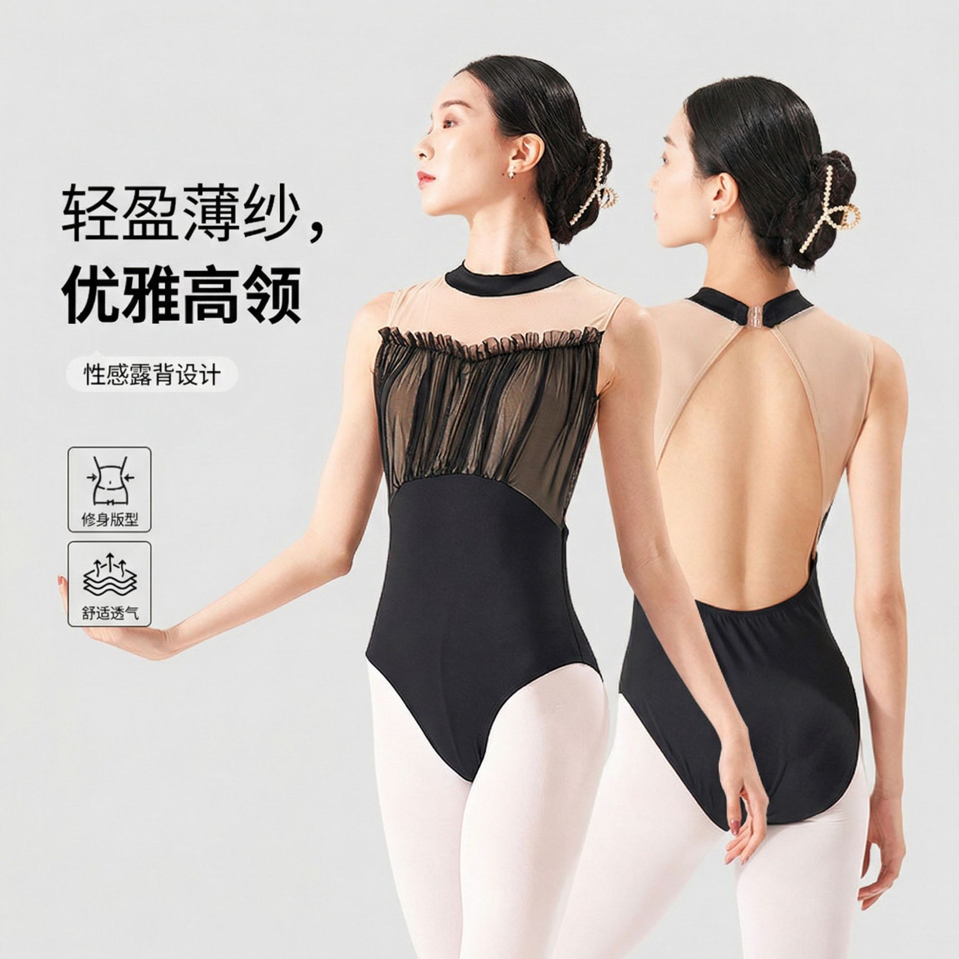 Pakaian balet wanita dewasa hitam seksi satu potong pakaian latihan tari guru baju latihan seni senam dengan bantalan dada