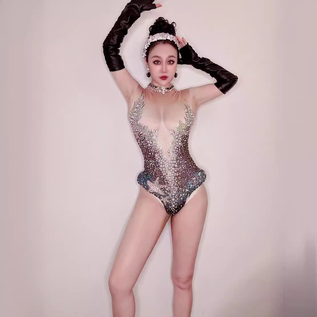 Novance pakaian olahraga, pakaian latihan tim tari ketinggian tinggi penyanyi Segitiga satu potong cetak mutiara berlian penuh klub malam bar