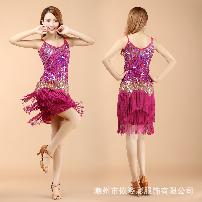 Gaun payet rumbai pelangsing wanita, pakaian pertunjukan kompetisi, gaun payet rumbai pelangsing, pakaian latihan dansa Latin wanita dewasa baru 2021