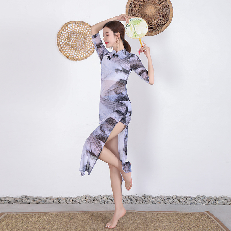 Pakaian latihan tari klasik cheongsam, pakaian penampilan tari wanita dewasa gaya Tiongkok Musim Semi