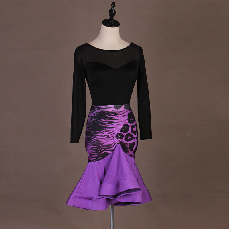 Pakaian latihan dansa, lengan jala, setelan latihan dansa Latin, Rok dansa persegi tiga langkah, motif macan tutul liar