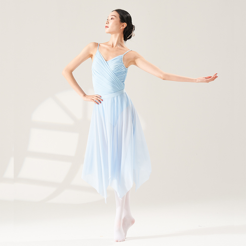Pakaian latihan balet senam rok kain kasa panjang setengah pakaian tubuh peri tari Tiongkok musim semi dan musim panas atasan selempang setelan satu potong