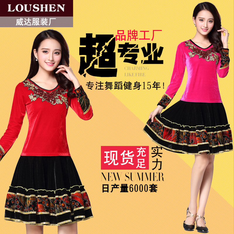 Luo gaun dansa persegi untuk wanita, pakaian dansa atasan lengan panjang beludru emas warna persegi baru musim gugur dan musim dingin