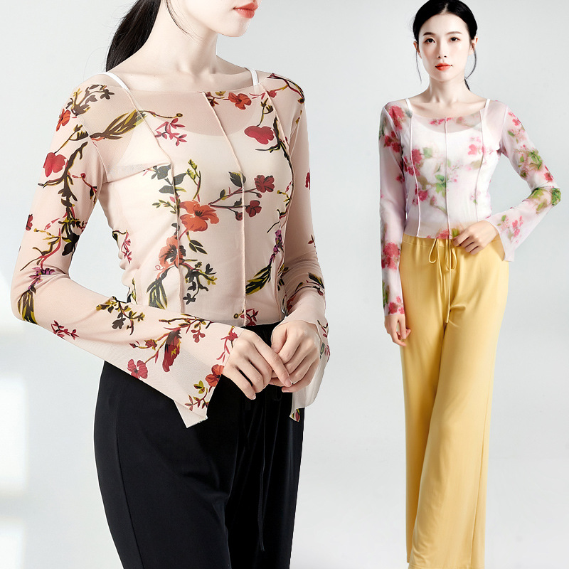 Pakaian latihan tari etnis modern wanita, cetak gaya Tiongkok, pakaian kasa pesona tubuh, ujian Seni dasar, pakaian dansa klasik untuk wanita