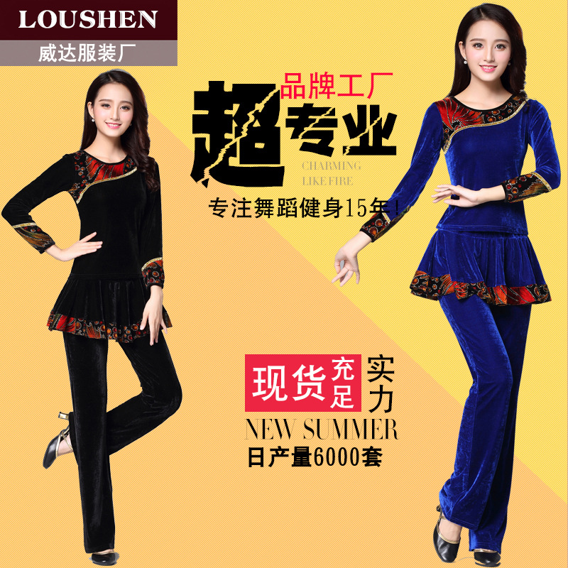 Setelan pakaian dansa persegi, pakaian tari setengah baya dan orang tua, celana rok V-neck beludru emas, pakaian performa