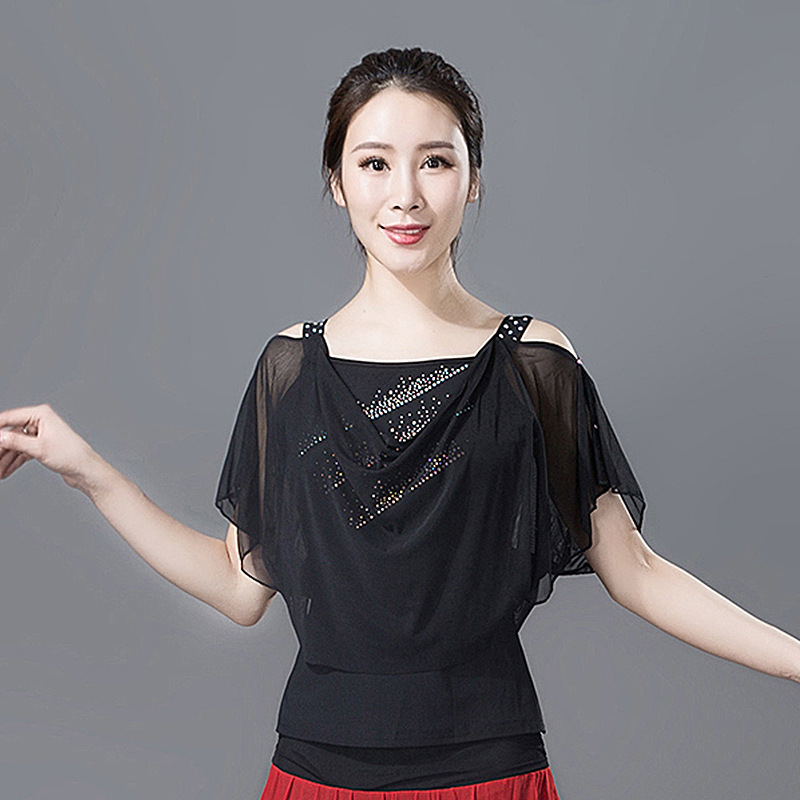 Pakaian dansa cinta Latin wanita, atasan latihan tari lengan pendek longgar baru dewasa leher V hitam persegi