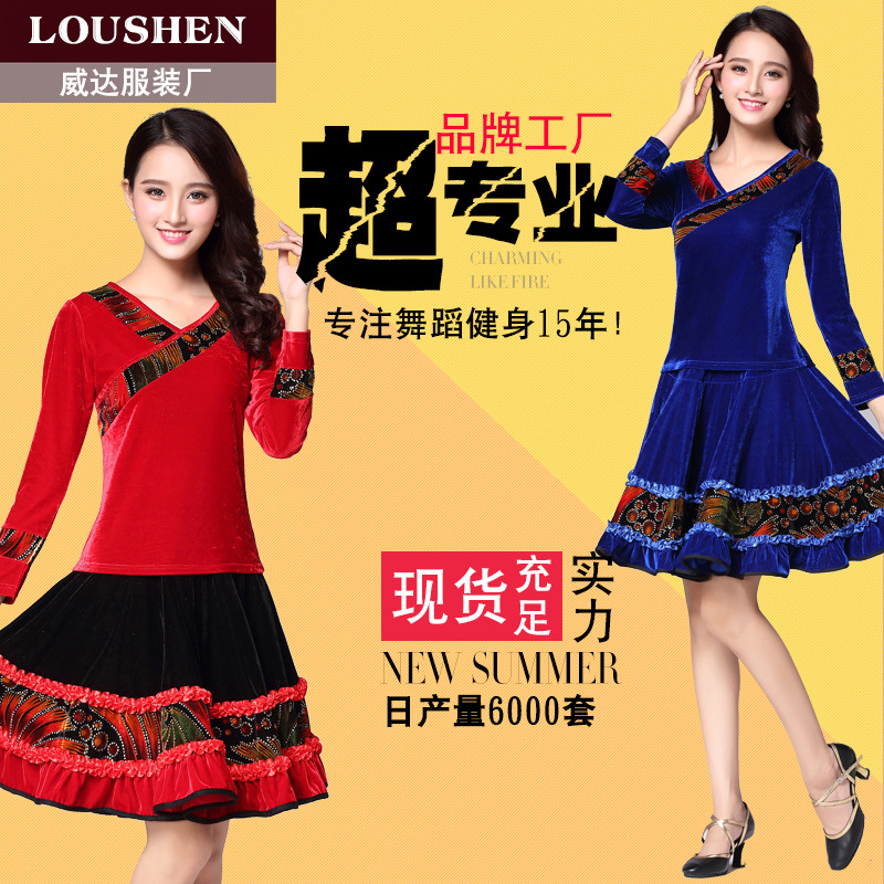 Pakaian dansa persegi wanita lengan panjang, setelan rok dansa beludru emas lengan panjang baru musim gugur dan musim dingin