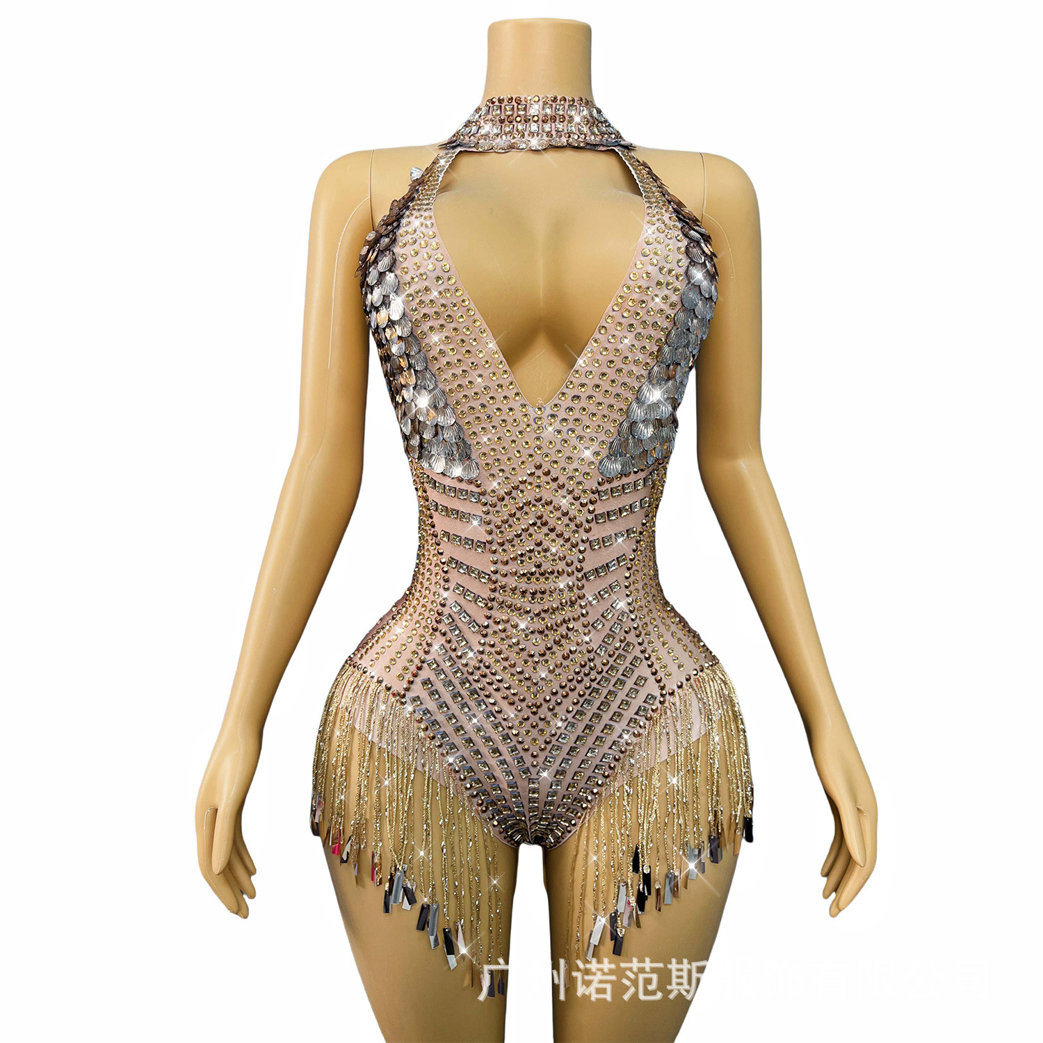Seksi V Dalam Warna Perak Berlian Imitasi Sisik Terang Rumbai Celana Jumpsuit Punggung Gantung Leher Pakaian Bernyanyi Modis Pakaian Pertunjukan Malam