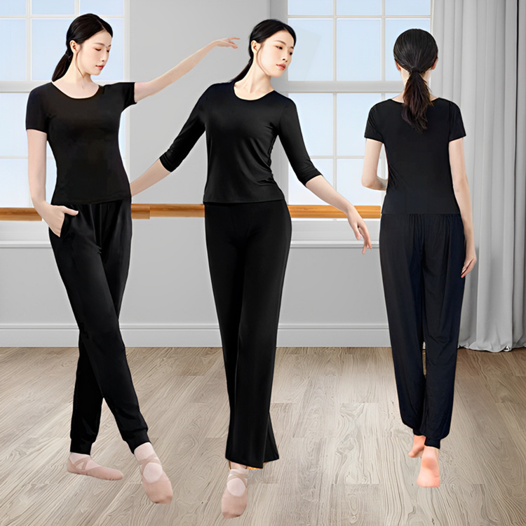 Pakaian dansa wanita leher bulat, pakaian latihan tari klasik wanita, celana suar hitam, pakaian dansa modern pelangsing