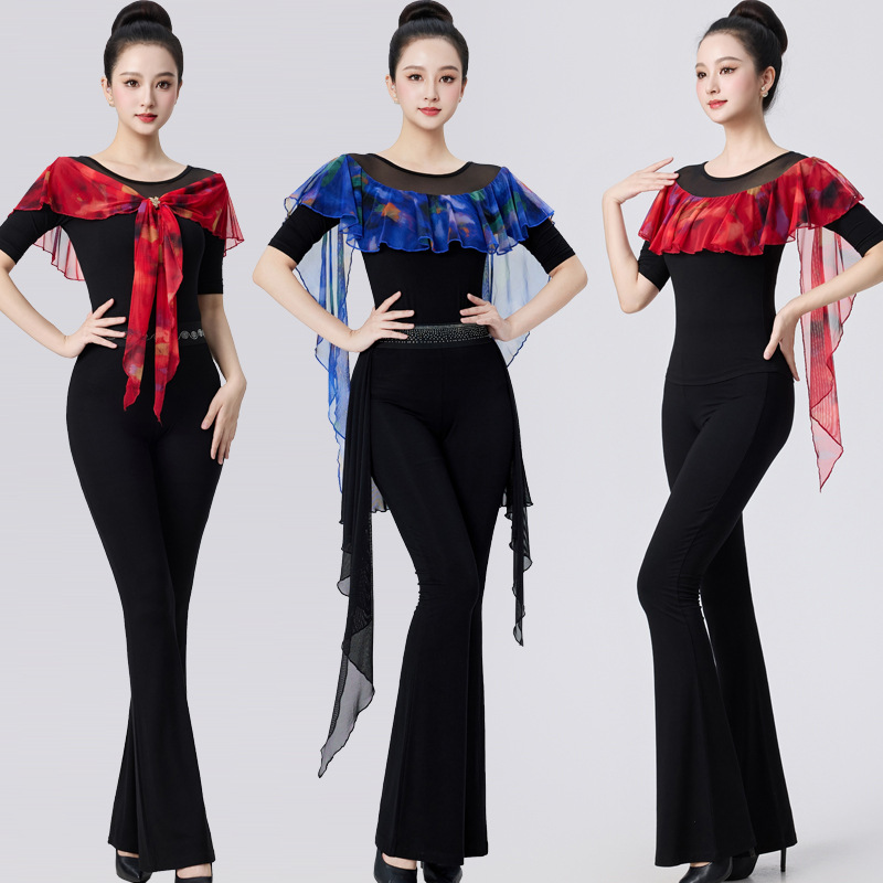 Baju Atasan Tari Modern Pakaian Tari ballroom Standar Nasional Model Baru Pakaian Atasan Pinggiran Daun Teratai Tari Latin Pakaian Tubuh Pakaian Latihan Wanita
