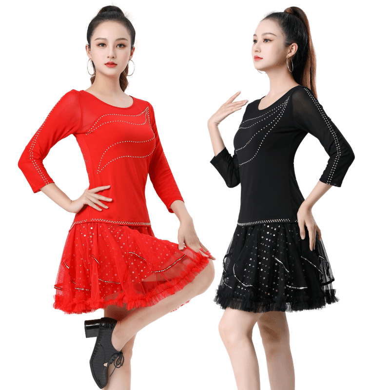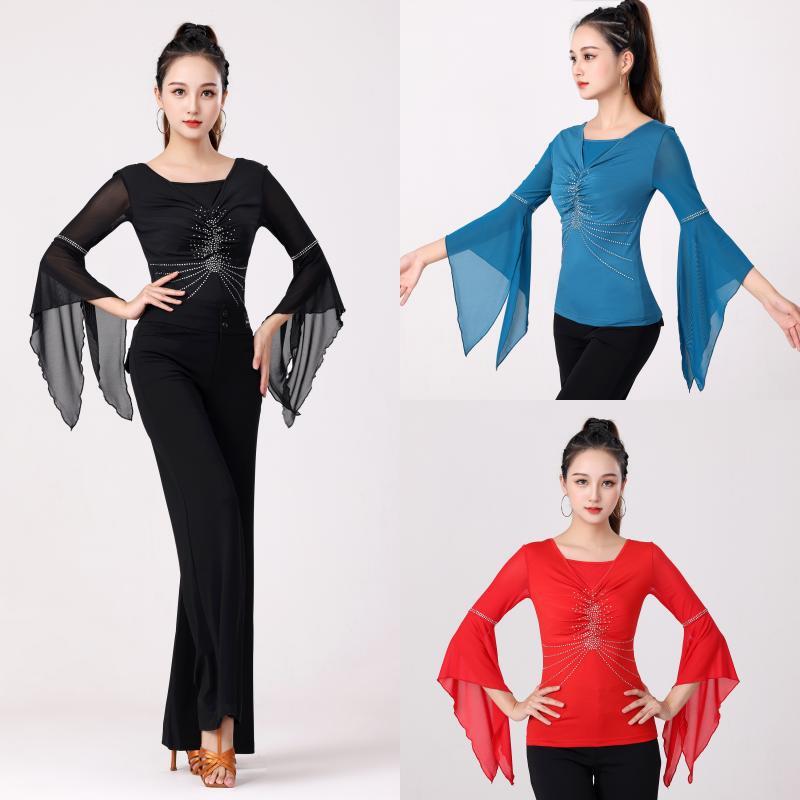 Square dance modern dance top berlian wanita baru leher bulat tanam baju lengan 3/4 tari elegan baju dansa Latin pakaian gitba