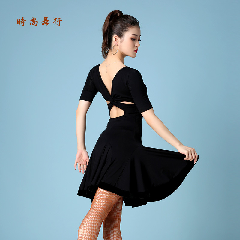 Pakaian latihan dansa Latin Ziman Atasan wanita dewasa baru 2021 pakaian latihan dansa hitam lengan pendek leher bulat tari modern ballroom