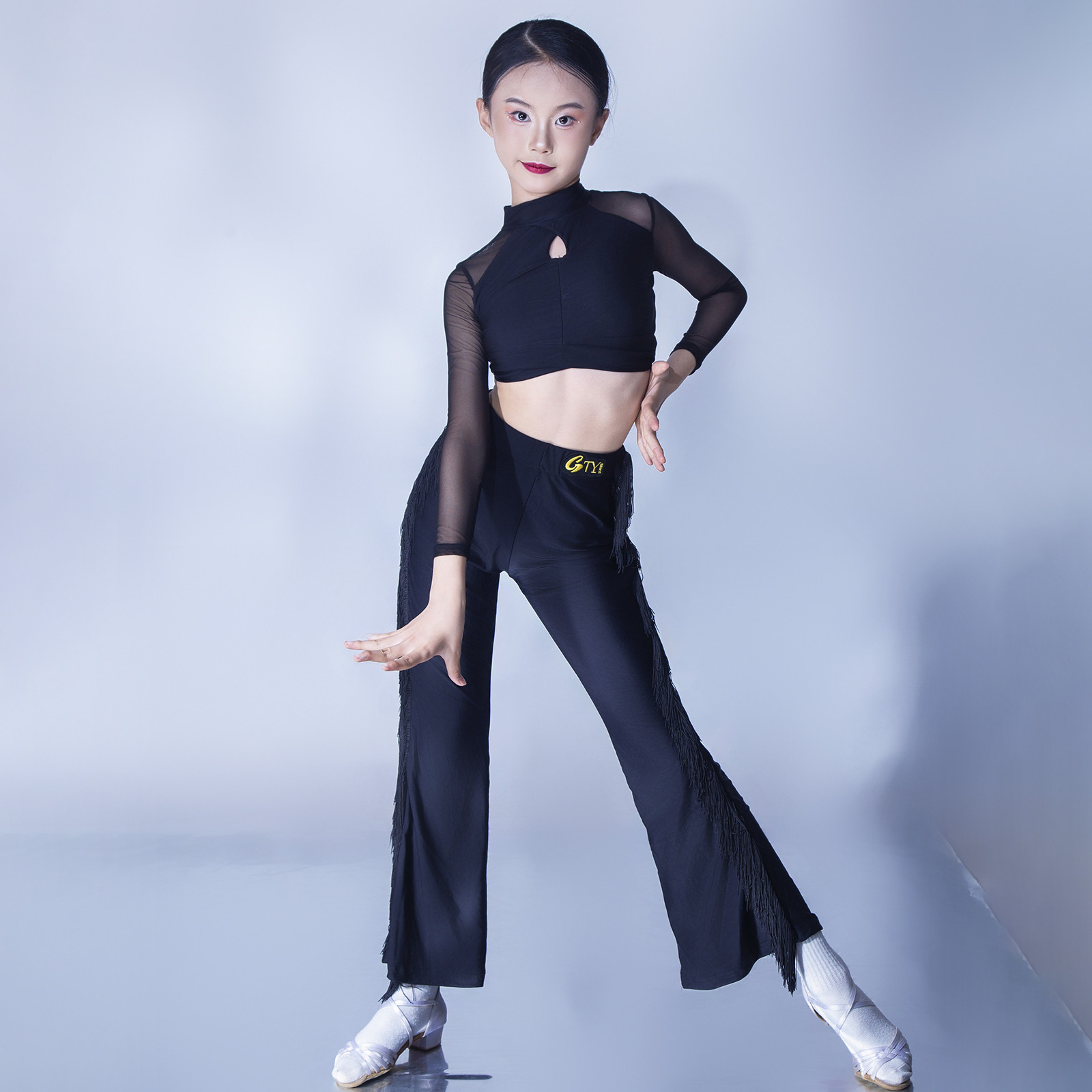 Pakaian latihan tari Yisha Latin pakaian latihan tari musim panas anak perempuan pakaian latihan profesional setelan pakaian kompetisi hitam