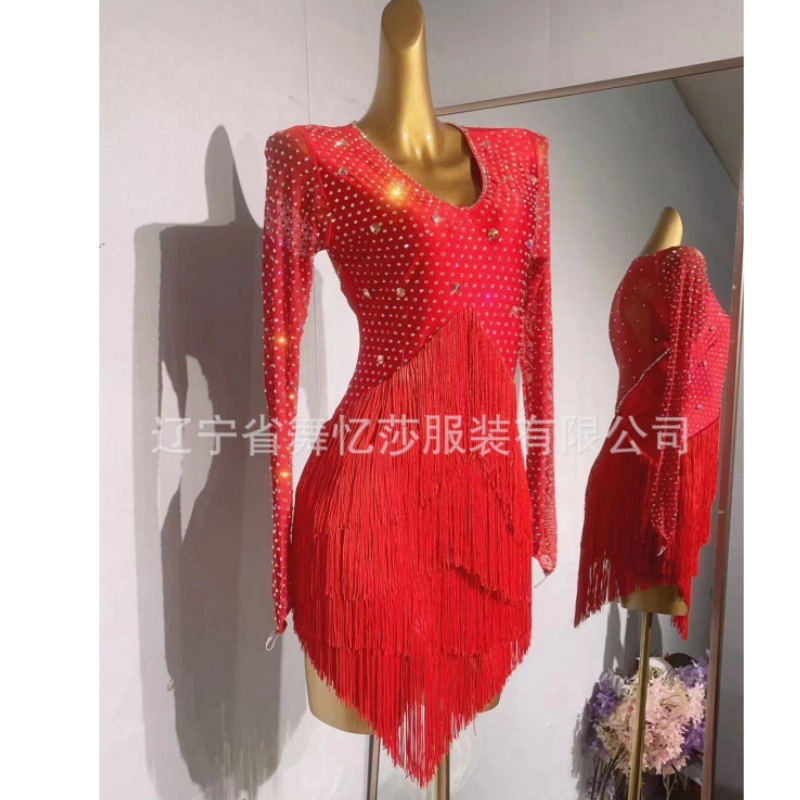 Baju dansa lengan panjang wanita, baju pertunjukan kompetisi profesional, pakaian dansa rumbai seksi baru musim panas, baju wanita lengan panjang, baju dansa Latin