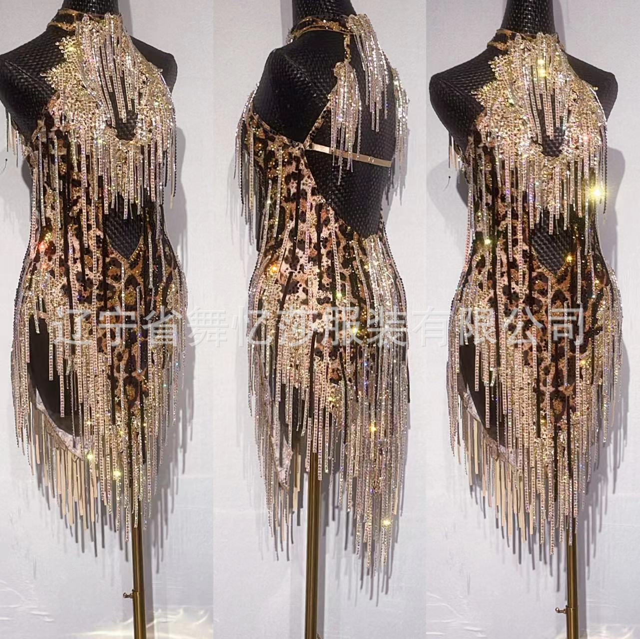 Kostum pertunjukan panggung penyanyi berumbai emas dan berhiaskan berlian imitasi, motif leopard seksi, kostum tari Latin, gaya Eropa dan Amerika.