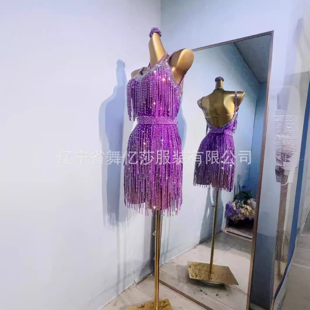 Kostum dansa Latin gaun bola kristal berkilau rumbai berlian imitasi ungu kostum dansa panggung punggung terbuka seksi