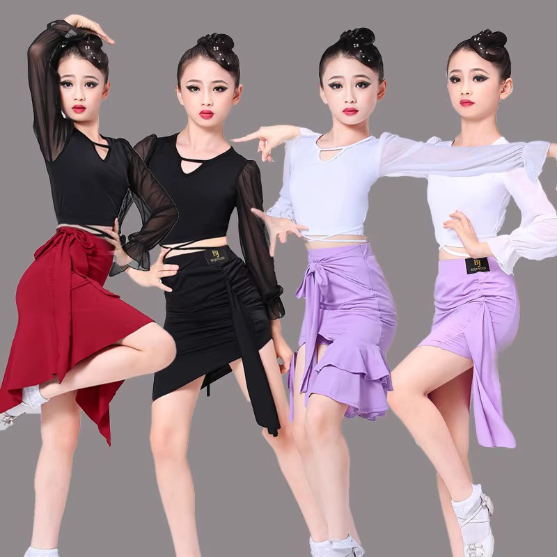 Rok dansa profesional anak perempuan, pakaian pertunjukan Latin, baju penampilan Latin, Rok dansa profesional, pakaian latihan anak perempuan