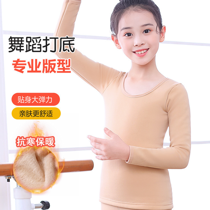 Baju dansa anak-anak, kemeja Dalaman warna daging, atasan hangat berlapis bulu tebal warna kulit tidak terlihat, setelan performa ketat