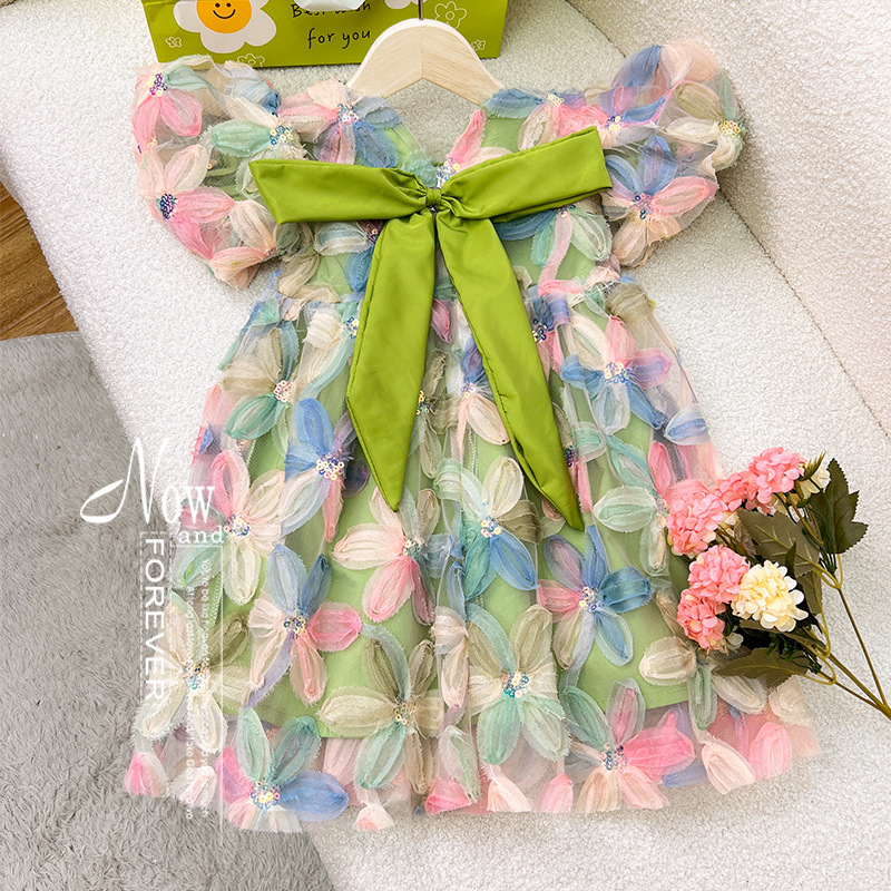 Rok kasa anak-anak Musim Panas 2024 pakaian penampilan 61 gaun bunga pita lengan puff anak perempuan kecil grosir