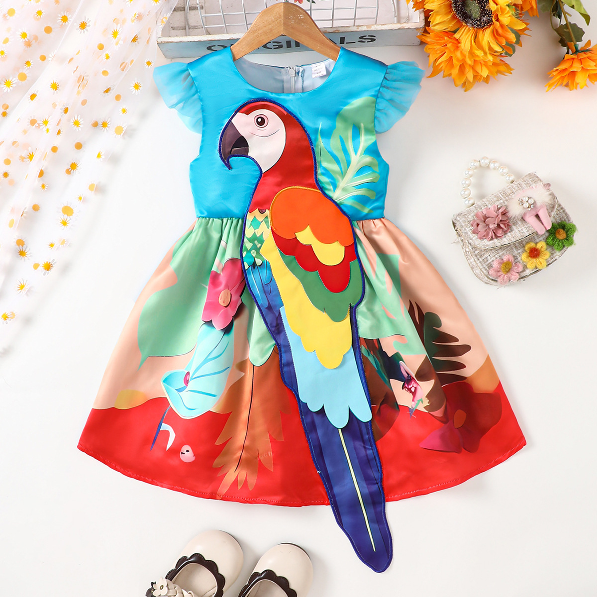 Gaun Lengan Terbang Sulam Burung Beo Imitasi Luar Biasa Anak Perempuan Kartun 3D Musim Panas Eropa dan Amerika Pakaian Pertunjukan