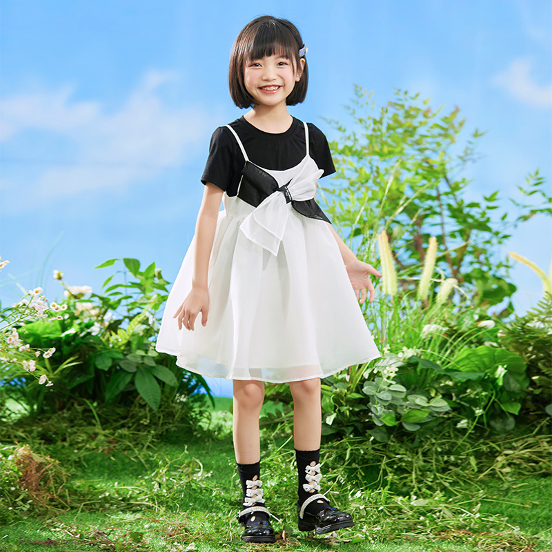 Gaun princess anak perempuan, gaun rok jaring putih lengan pendek performa panggung hitam untuk anak perempuan