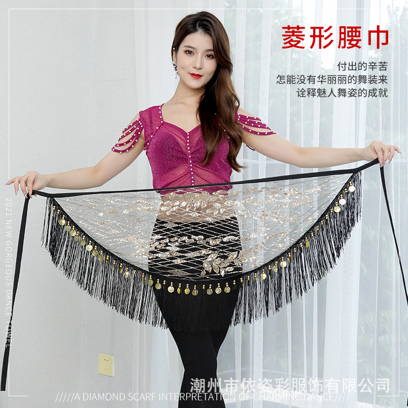 Handuk pinggul rumbai tari perut, rantai pinggang berpayet handuk segitiga latihan penampilan tari, handuk pinggang renda