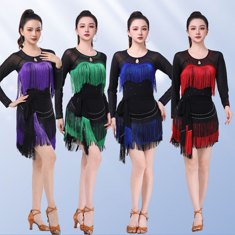 Pakaian Dansa Latin Baju Atasan Berlian Panas Rumbai Model Baru Lengan Panjang Tari Persahabatan Modern Gaya Premium Jiteba 3 Langkah Modis