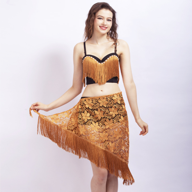Kostum tari perut bra rumbai atas handuk pinggang renda larut dalam air handuk pinggul setelan baju dansa Latin penampilan India
