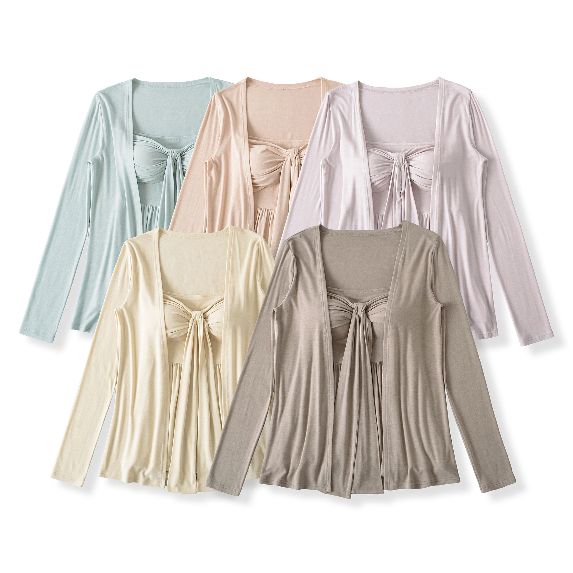 Lace-up kardigan lengan panjang wanita, pakaian pelindung matahari syal sling, pakaian luar musim panas sutra es kayu blus sifon mantel pendek