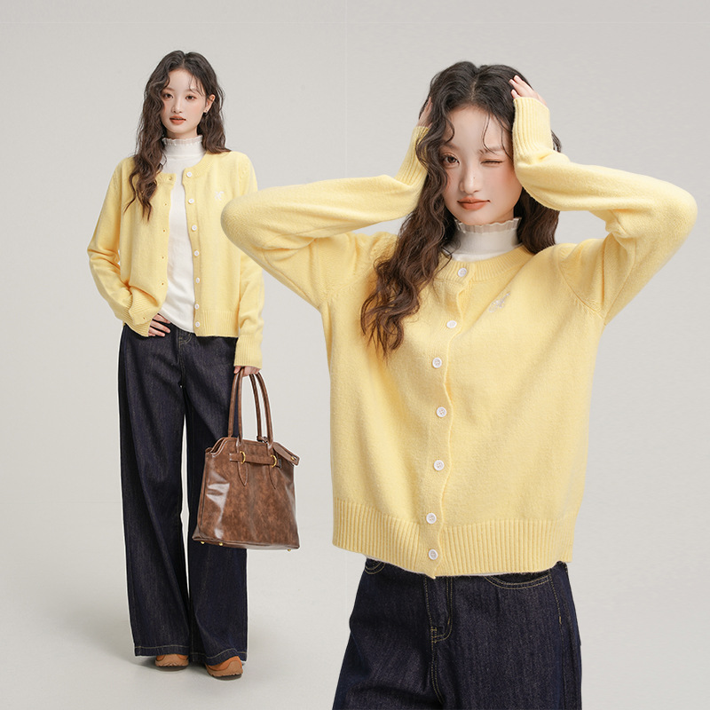 季优 黄色小香风刺绣针织长袖开衫女秋冬纽扣毛衣软糯短外套上衣