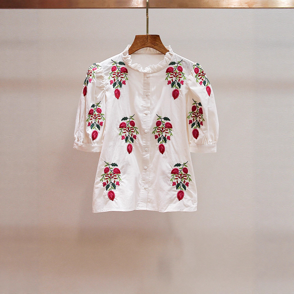 深圳南油高端女装秋季新款法式木耳边重工绣花泡泡袖开衫衬衫上衣