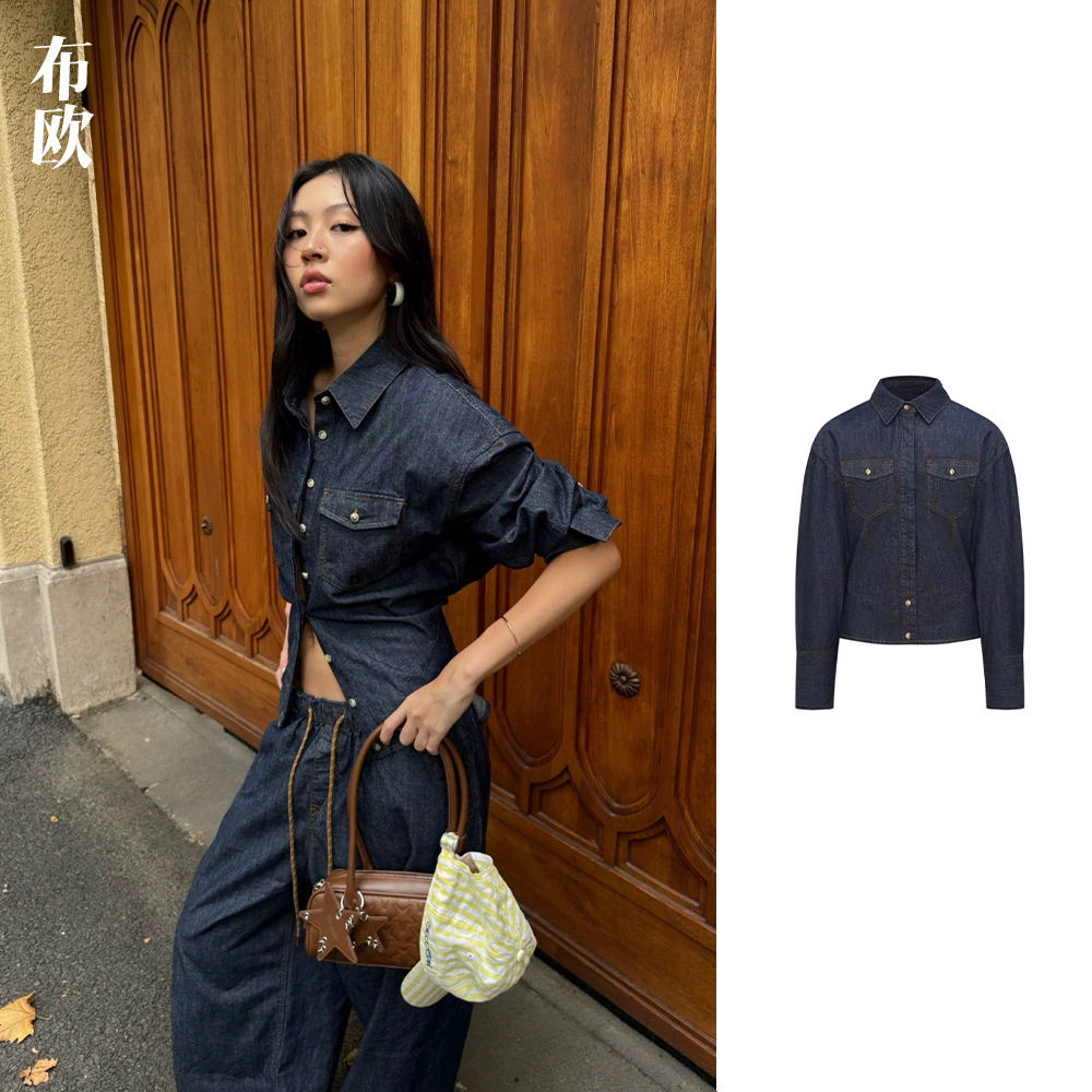 2024休闲风日韩休闲开衫衬衫领宽松型衬衫秋冬女收腰拼接高级个性