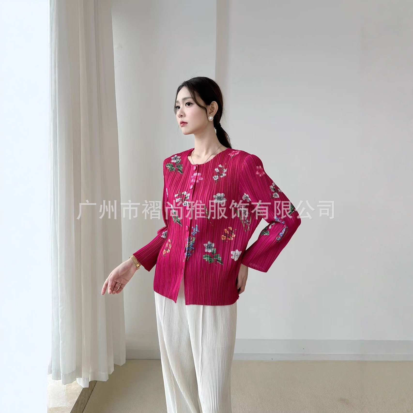 厂家直供2025秋季新款印花褶皱百搭圆领纽扣系开衫女装休闲上衣