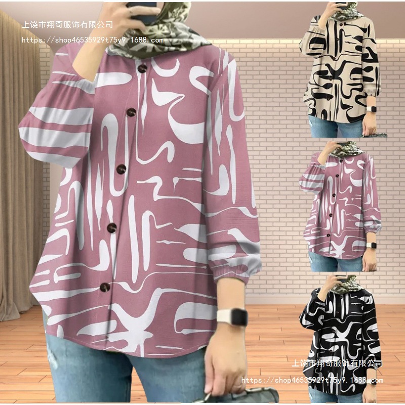 跨境外贸女士长袖圆领衬衫花卉图案3D印花清新风宽松开衫款式
