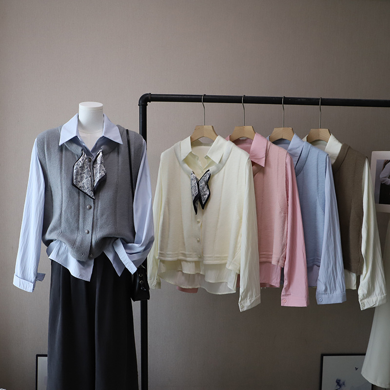 [比正]2025秋季新韩版配丝巾长袖衬衫+开衫针织马甲两件套女4771