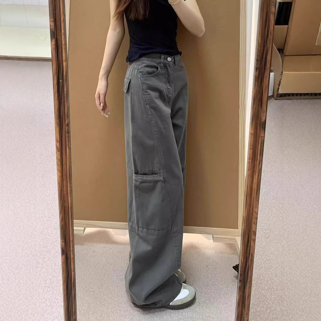 灰色牛仔工装裤女2025夏季新款美式复古高腰宽松直筒显瘦阔腿裤子