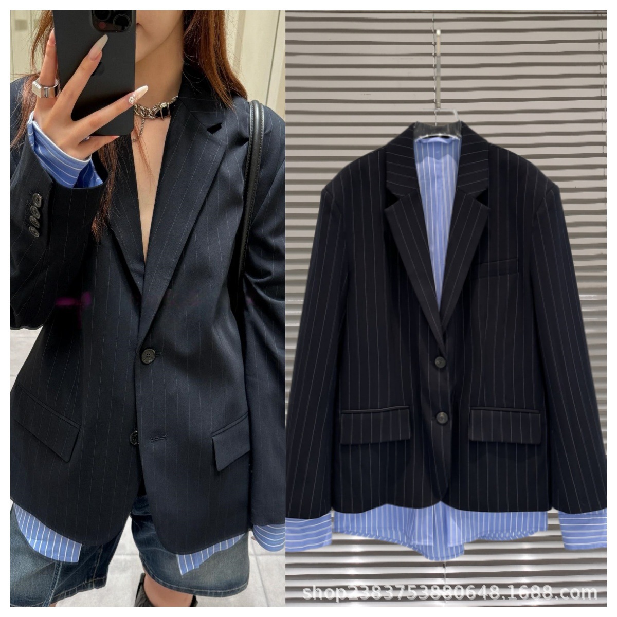 小众设计师款高级感25秋冬新款条纹撞色拼接假两件宽松西装外套女