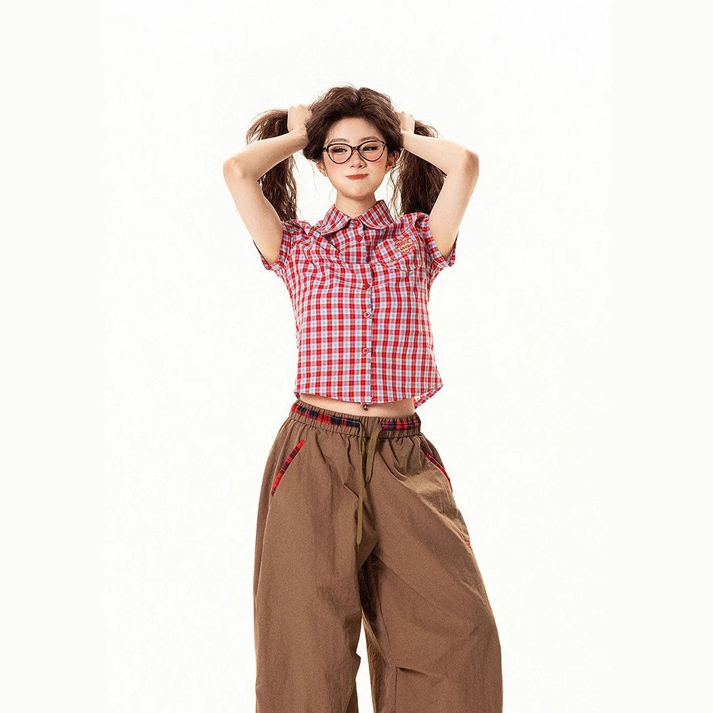 Kemeja Lengan Pendek Kerah POLO Kotak-kotak Retro Gaya Amerika Kemeja Model Pendek Mudah Dipadu Padan Terlihat Langsing Bahu Musim Panas Wanita Cardigan Jaket