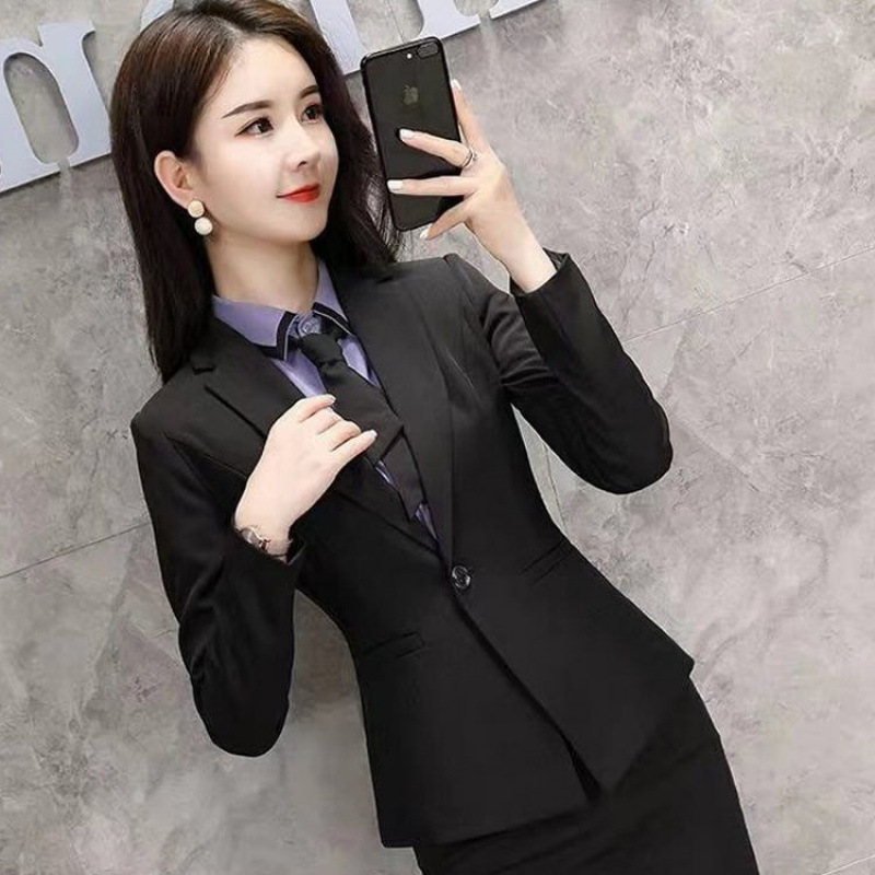 Setelan jas profesional warna biru tua untuk wanita, model musim gugur terbaru untuk pakaian kerja resepsionis hotel dan salon kecantikan.