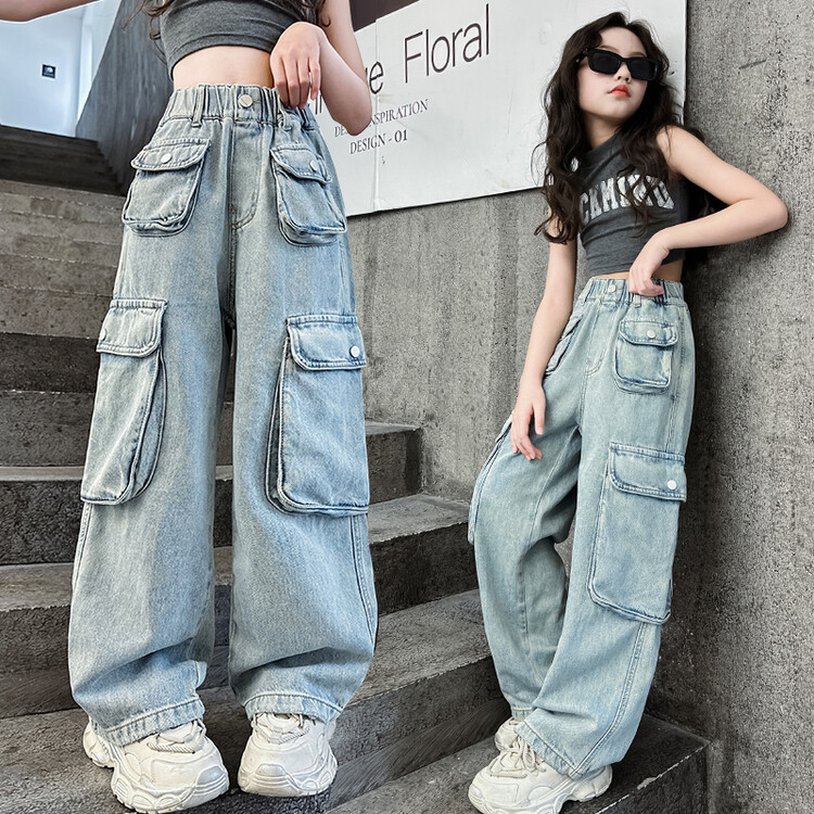 童装女童工装牛仔裤春秋童装儿童直筒裤子韩版潮酷宽松阔腿裤跨境